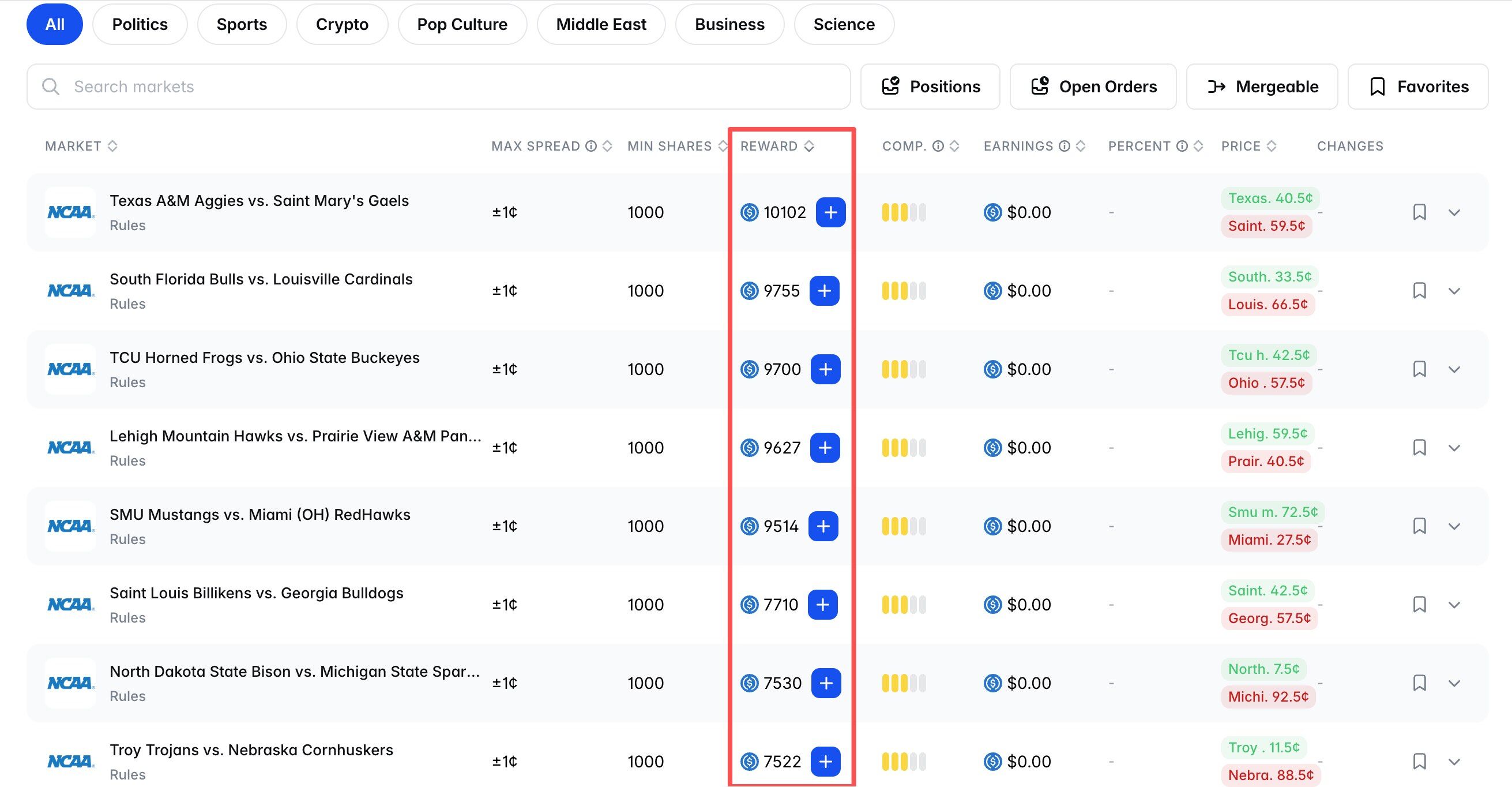 首先打开 Polymarket 的 Rewards 页面,点击后 Reward 后即可按补贴力度对所有事件进行排序。不难看出,目前 Polymarket 上补贴力度最大的事件均为 NCAA “疯狂三月”的比赛。 (我自己过去几个月都在 Polymarket 上组流动性,也从未见过如此级别的补贴力度。)