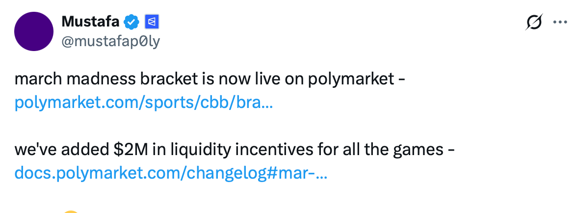 但当下,Polymarket 却提供了一个绝佳的机会窗口 —— 随着 NCAA “疯狂三月”的来临,Polymarket 已宣布将对相关赛事提供 200 万美元的 LP 补贴。