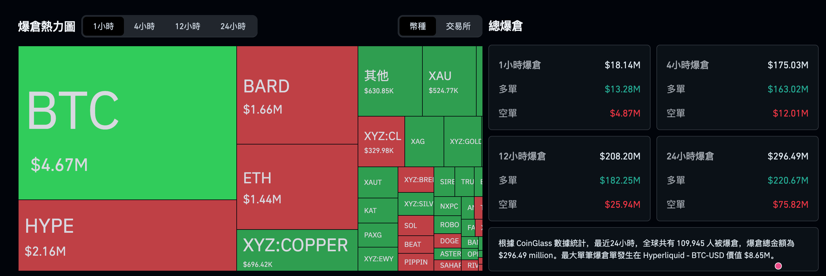 劇烈的價格波動往往伴隨著槓桿的連鎖清算。根據 CoinGlass 最新的數據統計,過去 24 小時內,加密市場共有 109,651 人 被強制平倉,爆倉總金額高達 2.9438 億美元 (約新台幣 93 億元)。