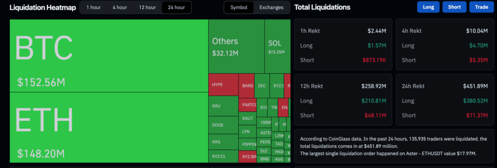 根據 CoinGlass 資料,過去 24 小時共有 135,908 名交易者遭到清算,爆倉總額達 $4.52 億。其中多單爆倉 $3.81 億(佔 84%),空單僅 $7,137 萬,顯示市場在 FOMC 前普遍做多,決議後遭到集體清算。BTC 爆倉 $1.53 億、ETH 緊追在後 $1.48 億。最大單筆爆倉發生在 Aster 交易所的 ETHUSDT 合約,價值 $1,797 萬。