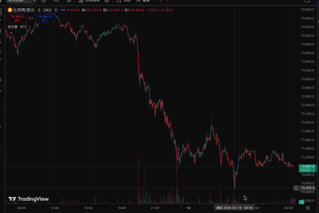 聯準會 3 月維持利率 3.5%-3.75% 不變,但鮑爾上調通膨預估、點陣圖今年僅剩 1 次降息空間,BTC 延續 FOMC 後賣訊息慣性跌破 $71,000,24 小時逾 13.5 萬人爆倉、金額達 $4.52 億。