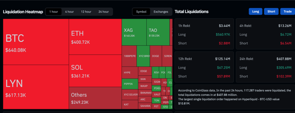 這一波下殺讓槓桿多頭付出慘痛代價。根據CoinGlass資料,過去24小時全網爆倉總額達$4.58億美元,超過12.8萬名交易者遭到強制清算。其中多單爆倉佔壓倒性的82%,金額高達$3.75億,空單僅$0.83億——說明這一輪是做多方全面遭到血洗,而非空頭主動踩踏。