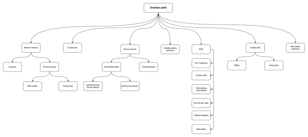 综上,2025 年链上总收益规模约 80 亿美元,但收益来源分布不均,部分收益即便可获取也难以稳定捕获(如 AMM 手续费、波动率收益),安全收益的空间更为有限。不过,随着 DeFi 持续创新与加密原生机会涌现,未来有望出现更多链上费用与收益捕获机制。
