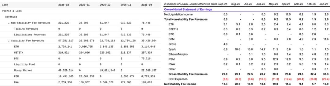 Sky 2025 年 - 2026 年初财务简报,数据来源:Dune、Sky 论坛