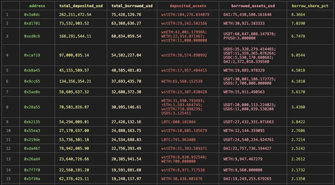 无论收益产生于何处,链上已出现可持续的收益来源,其对市场活跃度与杠杆需求的依赖度更低,与传统链上收益相关性较弱,为个人与协议提供了稳定的资金避风港。对 Sky 而言,多元化且灵活的配置策略使其能够在链上风险偏好回升时快速调整。此外,随着 USDS 成为实时规模最大的生息稳定币,结合头部借款人的行为可以看出,Sky 间接助力其他协议维持利率水平。