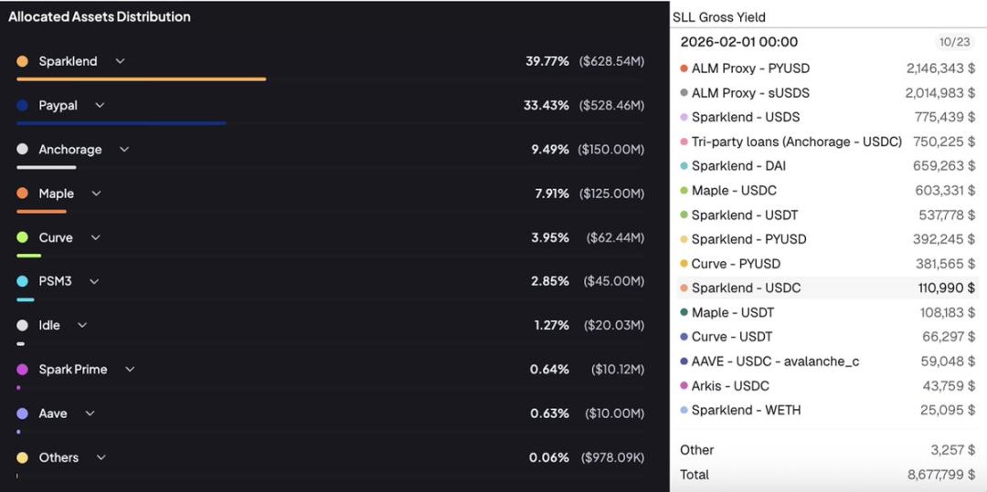 超过一半收入来自其他收益来源配置,具体投向随当前市场收益情况动态调整。例如,第三、四季度大量收益来自 Morpho、Maple、Ethena;当前每日收入则来自 Maple(10.6%)、Anchorage(11.2%)与 PayPal 存款收益(30%)。