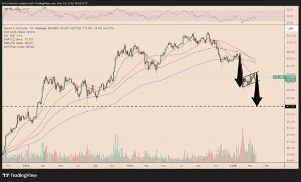 从技术分析角度来看,若比特币价格跌破当前所处的看跌旗形形态,未来数月内或进一步下探至 50,000 美元甚至更低水平。