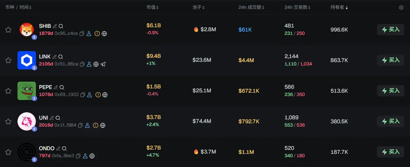 过去 24h ETH 热门代币前五依次为:SHIBLINKPEPE、UNI、ONDO