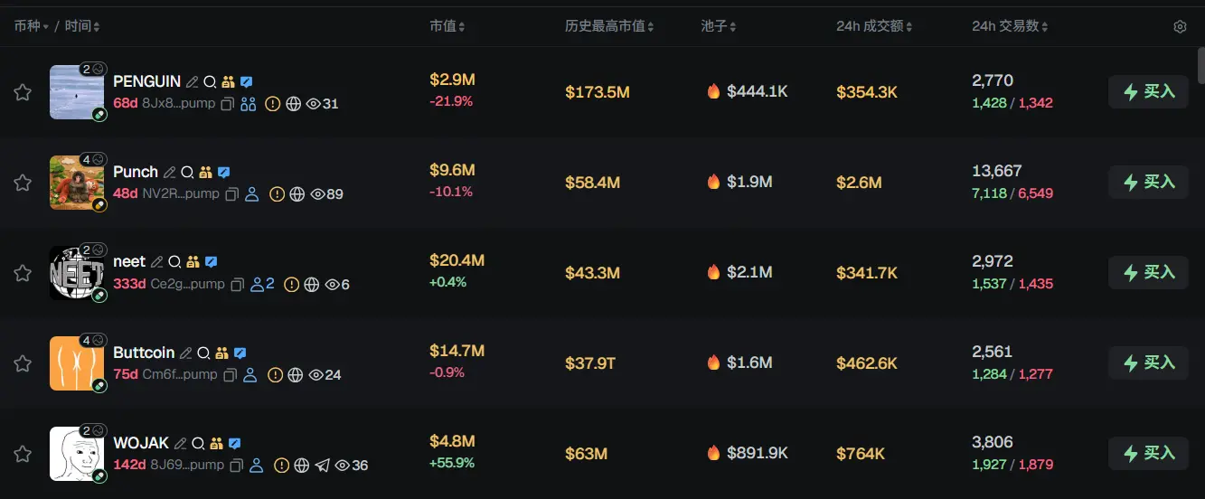过去 24h Solana 热门代币前五依次为:PENGUIN、Punch、neet、Buttcoin、WOJAK