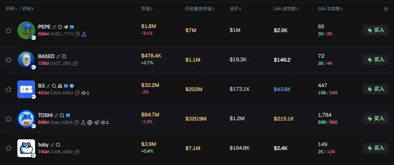 过去 24h Base 热门代币前五依次为:PEPE、BASED、B3、TOSHI、toby