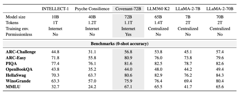 来做个比较:同为去中心化训练的 INTELLECT-1(Prime Intellect 团队出品,100 亿参数)MMLU 得分 32.7;另一个在白名单参与者中进行的分布式训练项目 Psyche Consilience(400 亿参数)得分 24.2。Covenant-72B 以 72B 的规模、67.1 的 MMLU 分数,在去中心化训练赛道中是个显眼的数字。