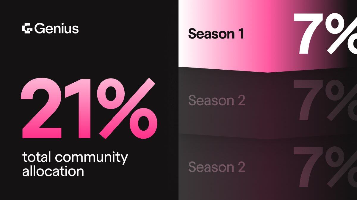 根据 Genius 此前所述, Season 1 将于 4 月 12 日前结束,更重要的是 4 月 12 日前将进行 TGE 。因此,4 月 12 日前进行 TGE 时社区空投份额为代币总供应量的 7%,即空投 7000 万枚代币。