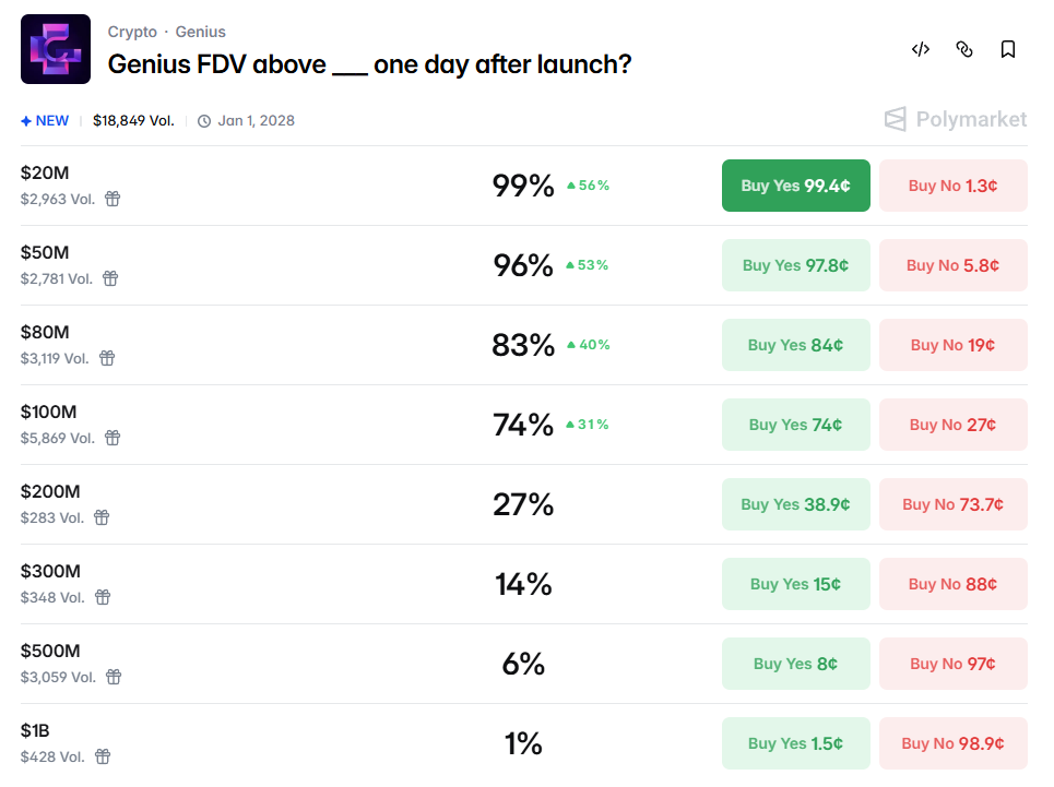 Polymarket 现已上线“Genius 开盘一日后 FDV”预测市场