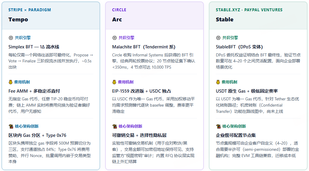 三条链均为支付专用 L1,但底层技术路线差异显著。以下从共识引擎、费用机制、核心架构创新三个维度拆解各自的技术选型。