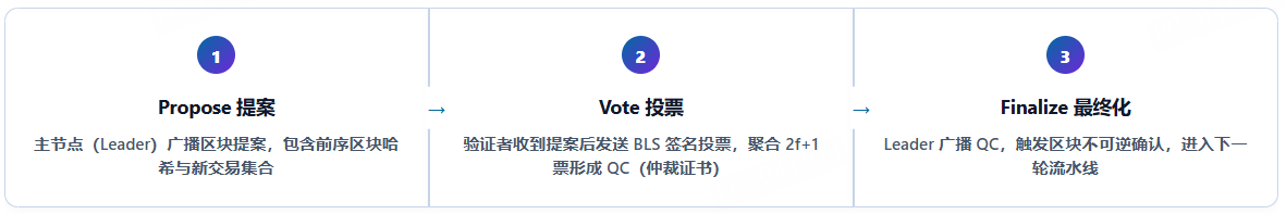 Tempo 的共识层基于 Simplex BFT 协议(ePrint 2023/463)。该协议通过流水线化设计,使每一轮确认延迟收敛至单个网络往返时间(1Δ)。