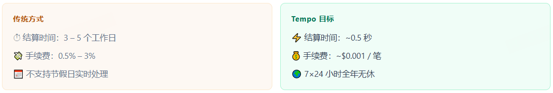 相比之下,Tempo 试图提供另一种路径:如果付款和收款双方都使用稳定币进行结算,按照当前测试网设计目标,一笔 USDC 到 USDC 的跨境支付理论上可在约 0.5 秒内完成,单笔手续费约为 0.001 美元。