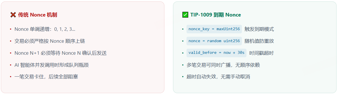 传统EVM的严格递增Nonce强制同一账户所有交易串行执行。Tempo将Nonce改为"有效区块范围",仅要求Nonce在有效期内唯一,同一账户多笔相互独立的交易可同时提交并并发执行,消除账户级串行瓶颈。
