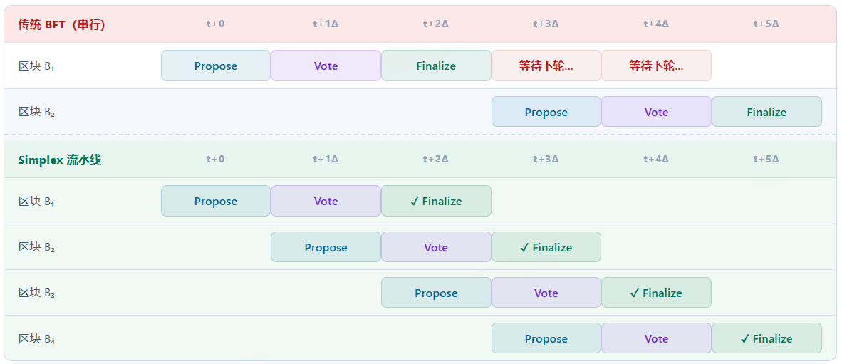 性能提升关键: 在流水线模式下,B₂ 的 Propose 阶段与 B₁ 的 Vote 阶段重叠进行。每一轮仅需等待 即可进入下一区块的提案,而传统 BFT 每轮需要完整的 串行等待。