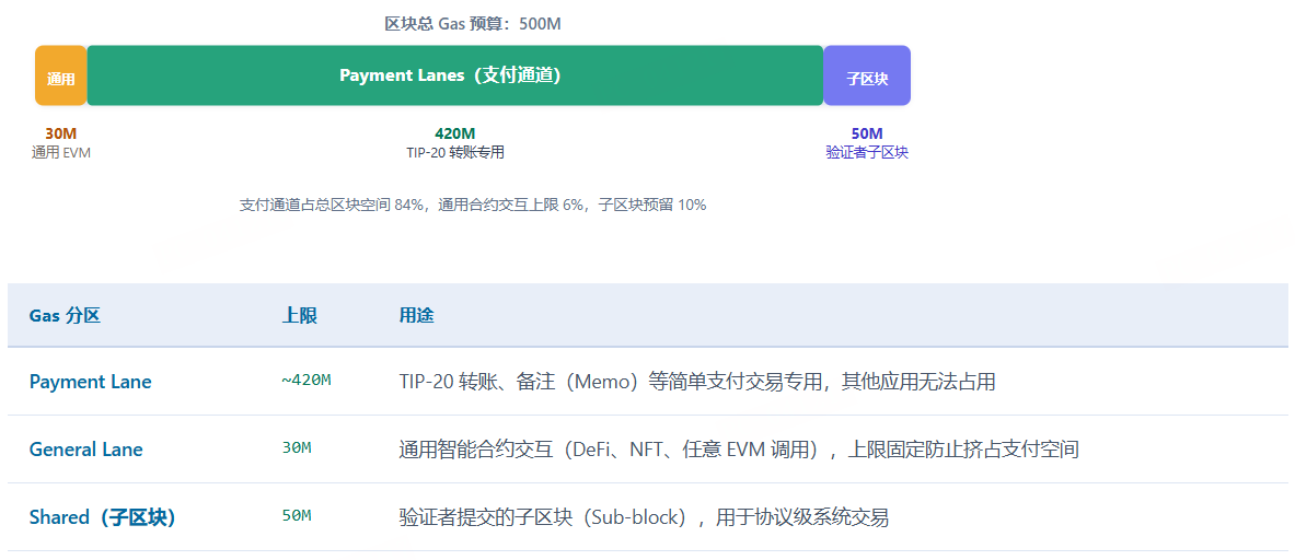 ayment Lanes 是 Tempo 在协议层面为 TIP-20 支付交易 专项预留的区块空间 。与以太坊将所有交易竞争同一 gas 池不同,Tempo 将区块 gas 预算拆分为多个独立通道,使支付交易不受 DeFi 操作、NFT 铸造或高频合约调用的"嘈杂邻居"干扰。