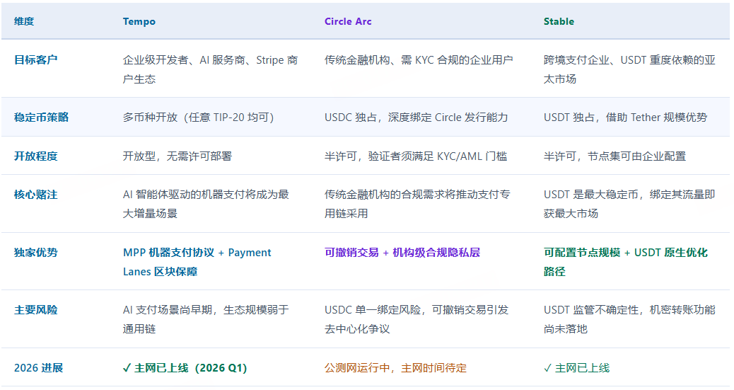 6.1 支付专用链:Tempo vs Circle Arc vs Stable