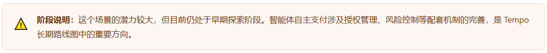 随着 AI 智能体越来越多地被用于执行复杂商业任务(预订资源、采购物资、调用外部服务),这些智能体会产生真实的支付需求。Tempo 的 EVM 兼容架构和专属支付接口,使智能体可以通过智能合约自主触发支付,无需人工审批每一笔交易。