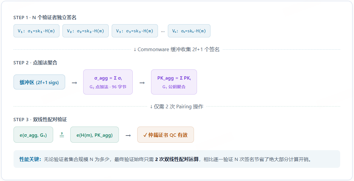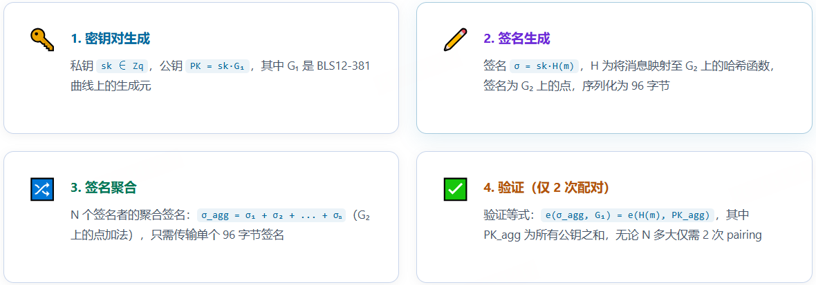 采用BLS(Boneh-Lynn-Shacham)方案将N个验证者签名聚合为单一签名,仅需两次椭圆曲线配对运算验证,显著降低带宽与计算开销。这对高频微支付场景尤其重要,能够有效降低每笔交易的计算和带宽成本。
