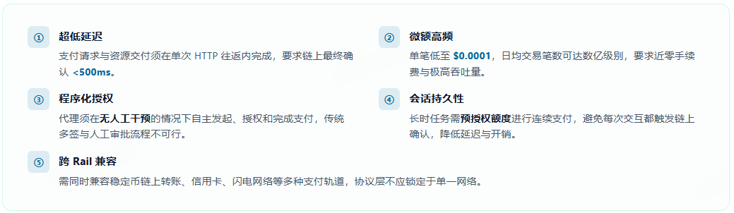 AI代理(Autonomous AI Agents)在执行自主任务时,其支付行为与传统人类支付存在本质差异。以下五大核心需求构成了AI代理经济对支付基础设施的基本要求: