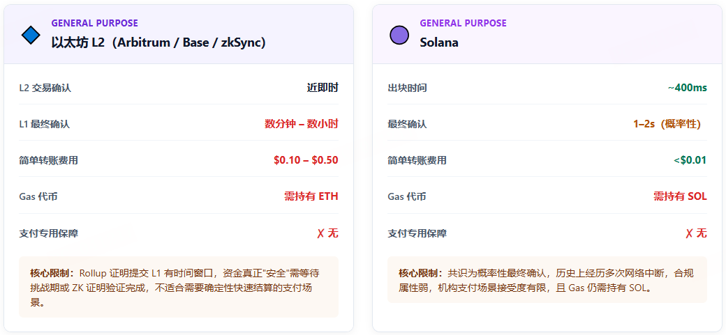 以太坊 L2 与 Solana 是目前在支付场景被广泛使用的两类通用链,与支付专用链的核心差距体现在以下几个维度: