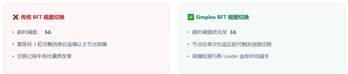 视图切换(View-Change)在两种情况下触发:(1)当前领导者(Leader)在规定超时时间内未能广播有效提案;(2)节点检测到领导者行为异常(如重复提案或消息格式非法)。