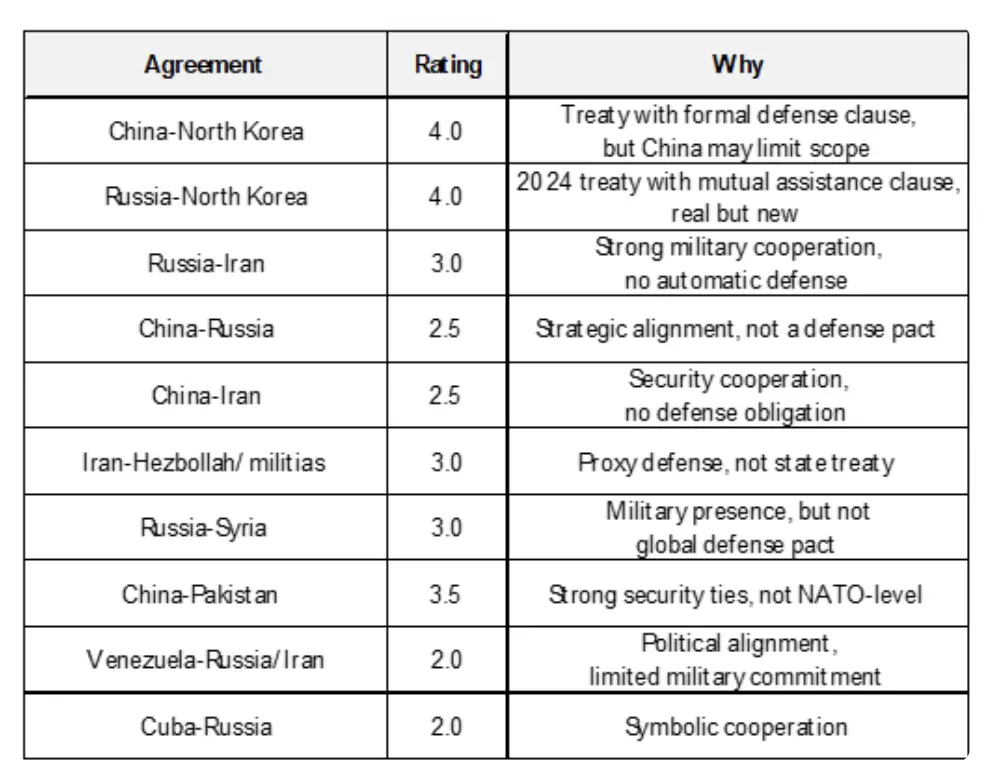 下面列出的是我认为最重要的一些条约,包括它们所隐含承诺强度的 1 到 5 分评级,以及每项条约的简要说明。总体来看,其他衡量结盟关系的指标——比如领导人表态和实际行动——大体都与这些条约所反映的关系一致。不过,现在也越来越清楚地看到,所有这些条约,尤其是与美国相关的条约,都可能发生变化,而真正的行动,最终会比协议文本本身更有分量。