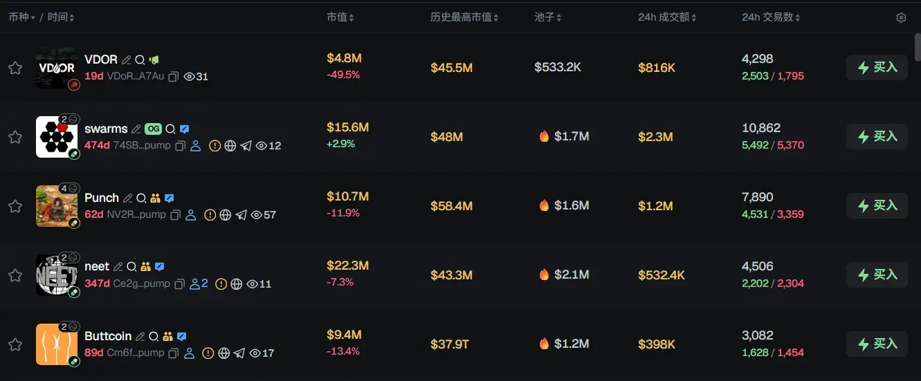过去 24h Solana 热门代币前五依次为:VDOR、swarms、Punch、neet、Buttcoin
