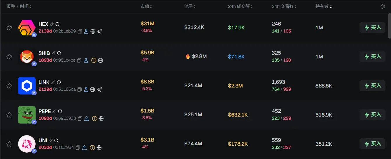 过去 24h ETH 热门代币前五依次为:HEX、SHIB、LINK、PEPE、UNI