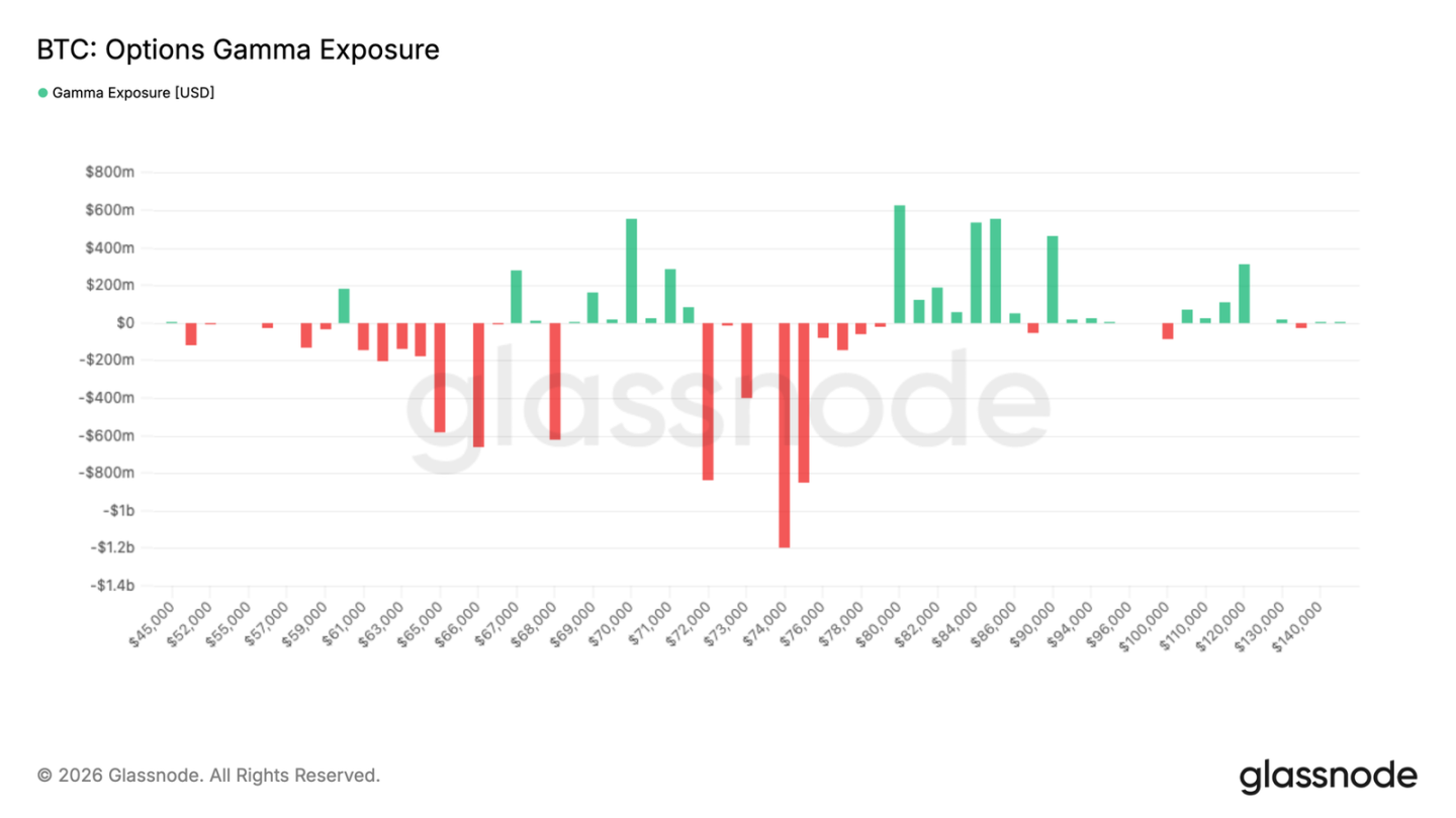 这种结构现在已经演变。负伽马主要位于当前价格上方。而在 69000 和 71500 美元之间则形成了一个正伽马区域。这提供了短期的下方支撑,因为在该区间内,交易商有动机在价格下跌时买入。