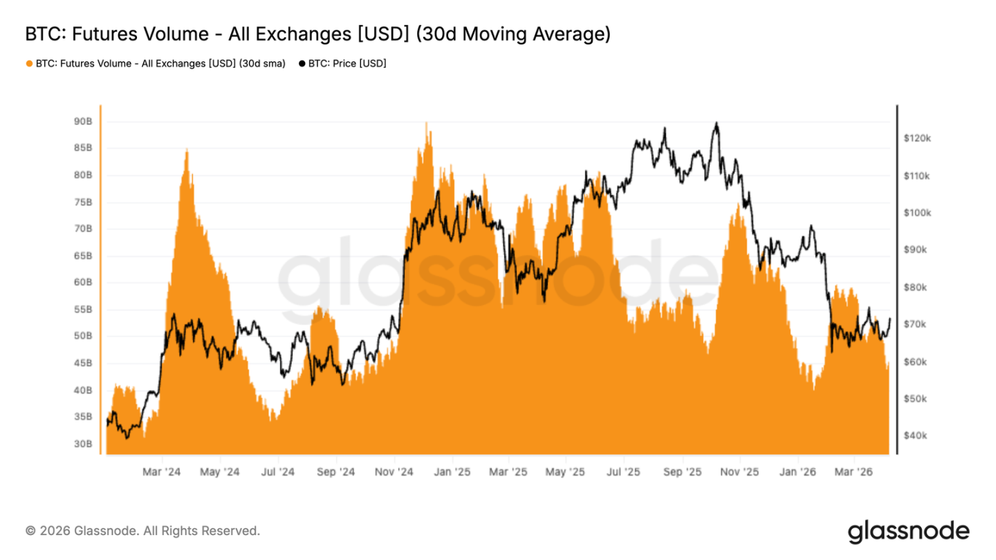 现货活动仍然疲软。币安的三十天相对交易量仍低于基准线,并在其区间低位附近徘徊。近期数据显示仅有小幅回升,但没有任何迹象表明参与度显著回归。