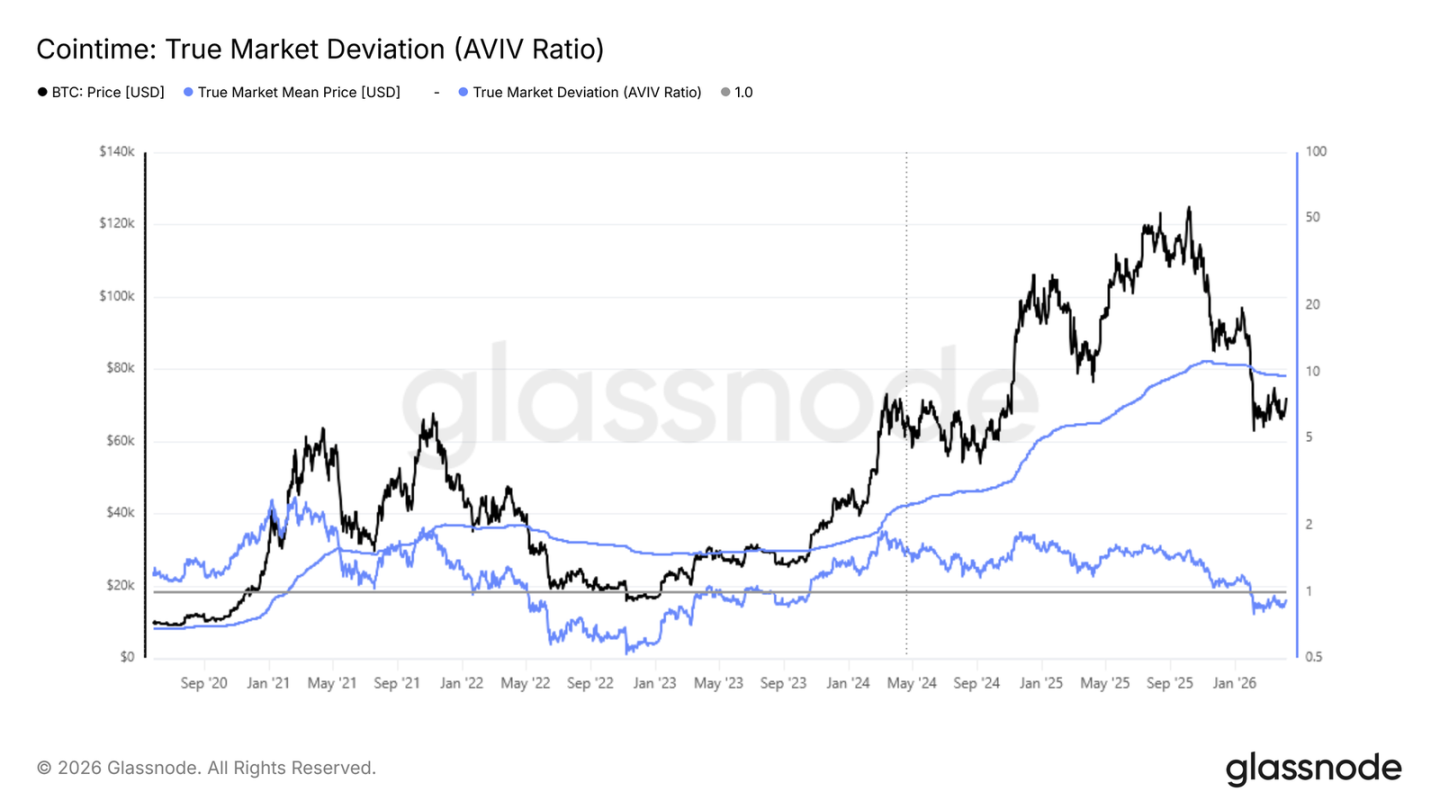 既然 78000 美元的真实市场均值是任何反弹行情可能的中期天花板,那么 AVIV 比率就提供了一个精确的量化视角,用于将当前市场状态与以往的熊市周期进行比较。