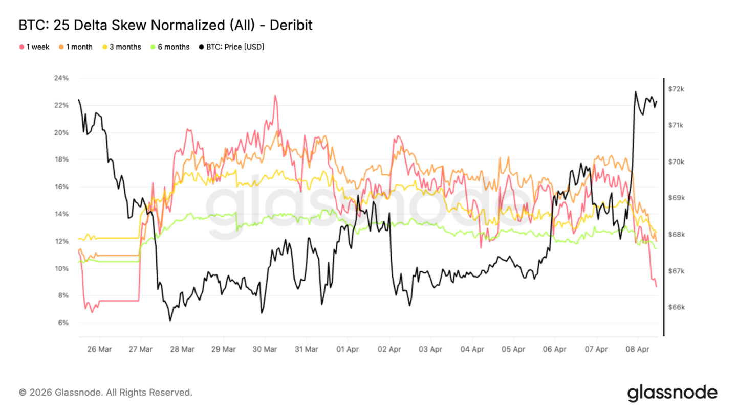 尽管波动率整体有所缓解,但期权的相对定价仍然反映出防御性偏向。虽然偏斜在停火声明后略有缓和,看跌期权一侧从接近百分之二十降至百分之十出头,但这一调整似乎更像是消息面驱动的挤压,而非看涨与看跌期权需求之间的结构性转变。