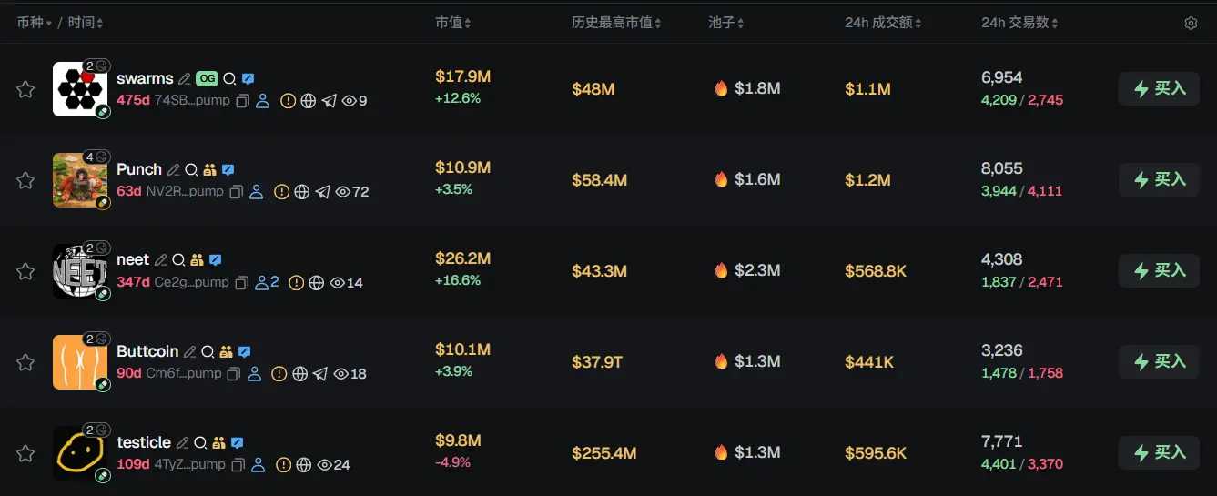 过去 24h Solana 热门代币前五依次为:swarms、Punch、neet、Buttcoin、testicle