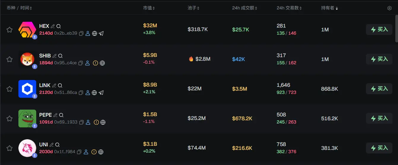 过去 24h ETH 热门代币前五依次为:HEX、SHIBLINKPEPE、UNI