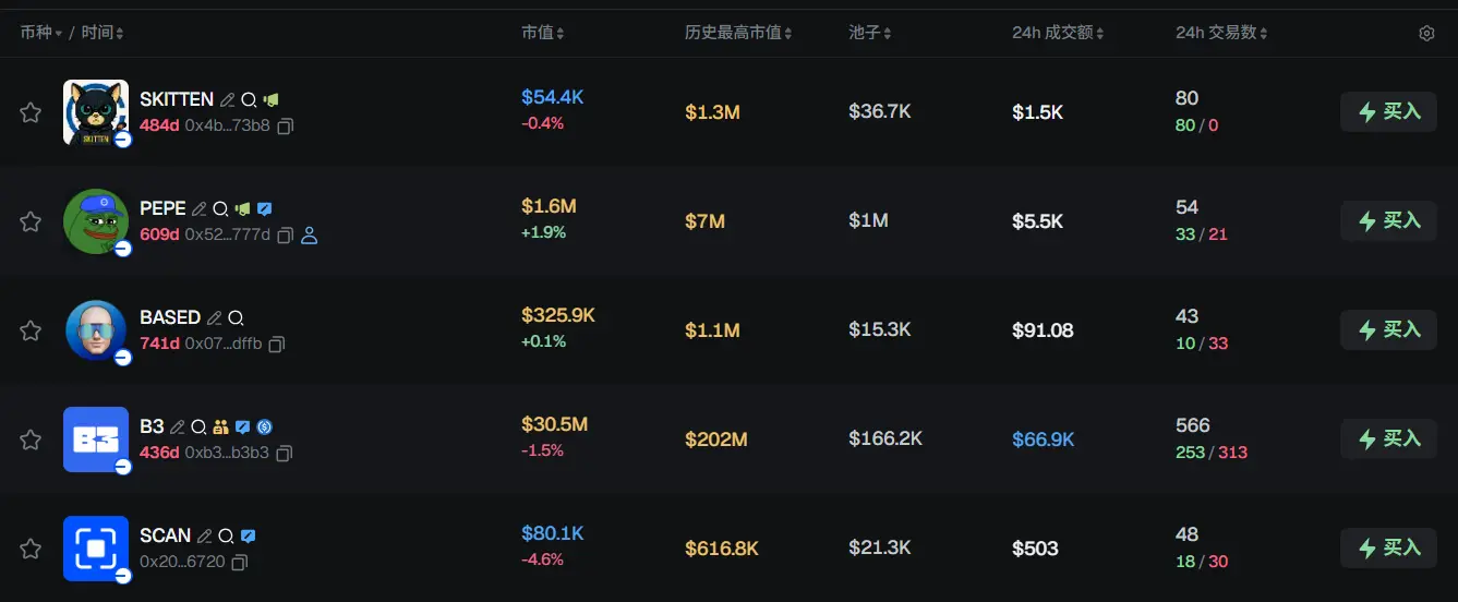 过去 24h Base 热门代币前五依次为:SKITTEN、PEPE、BASED、B3、SCAN
