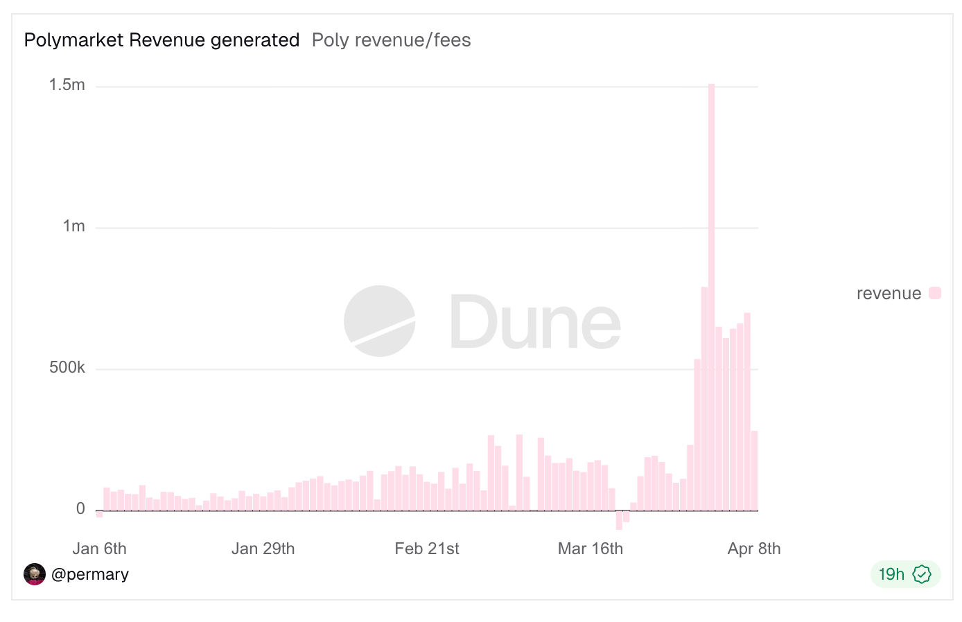 最新的案例是彻底打开了手续费闸门的 Polymarket。自近期扩大手续费范围并修改手续费公式(推荐阅读:《 硬核拆解Polymarket手续费公式:90+%的极端费率是怎么蹦出来的? 》)以来,Polymarket 的营收能力已大幅跃升;截至发稿前,Polymarket 的手续费总收益已超 2400 万美元, 4 月 2 日单日更是创下 150 万美元的日收益记录。