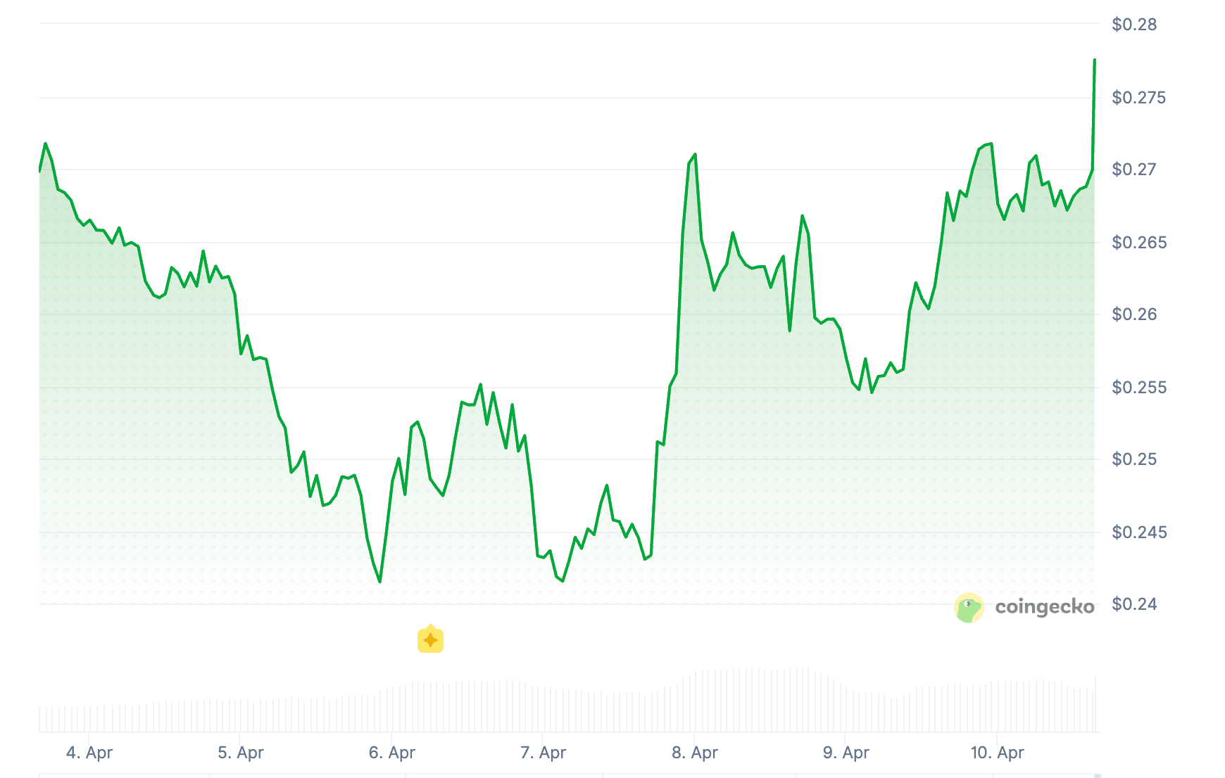 受此激勵,世界幣應聲跳漲 3%,暫報 0.28 美元。
