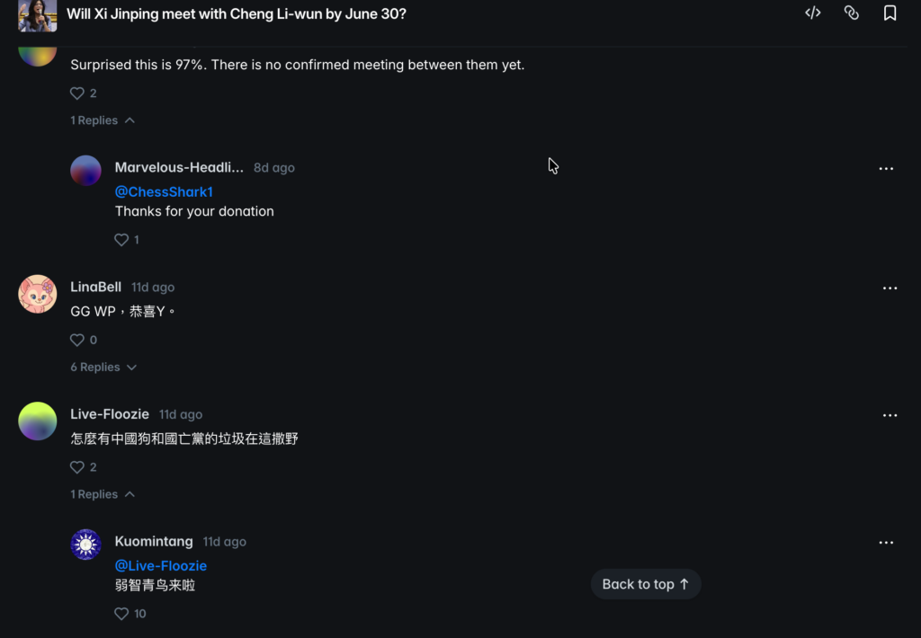 幾個小彩蛋:用戶名為「Kuomintang」的地址,在 Yes 已達 $0.999 時花 $51 買了 51 股。幾乎沒有獲利空間,但選擇參與了這筆交易;而在留言區中,更是有人譏諷那些賭NO的為青鳥,實則也變成政治發洩場域。