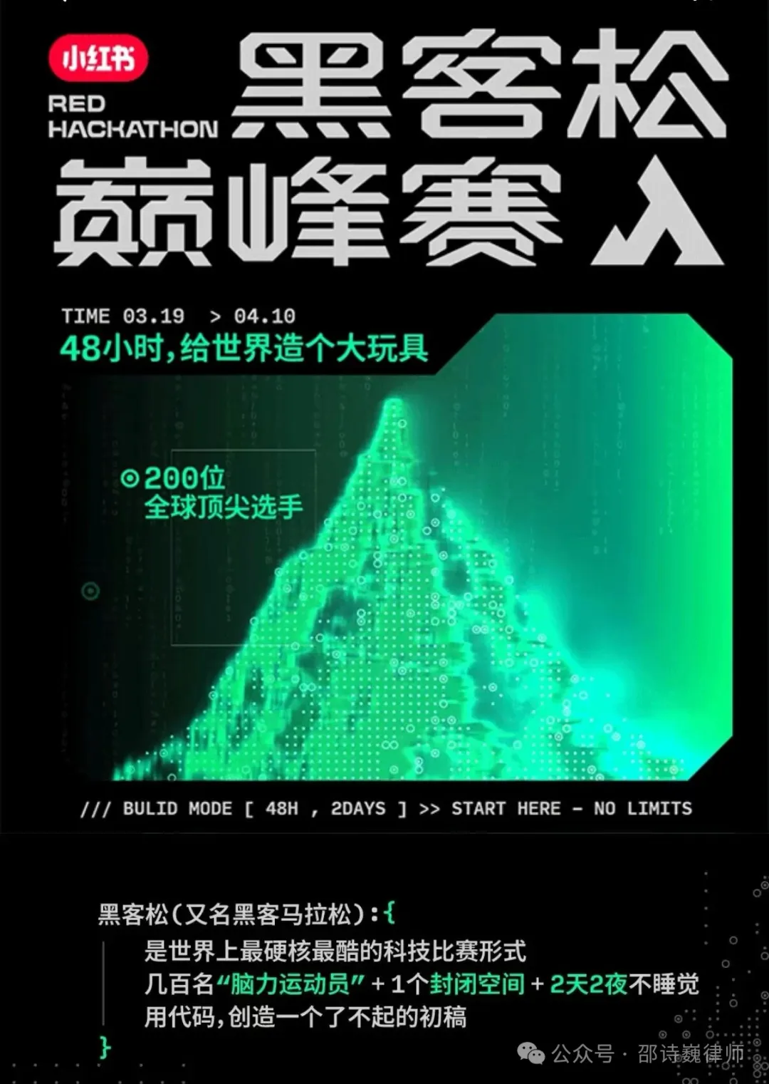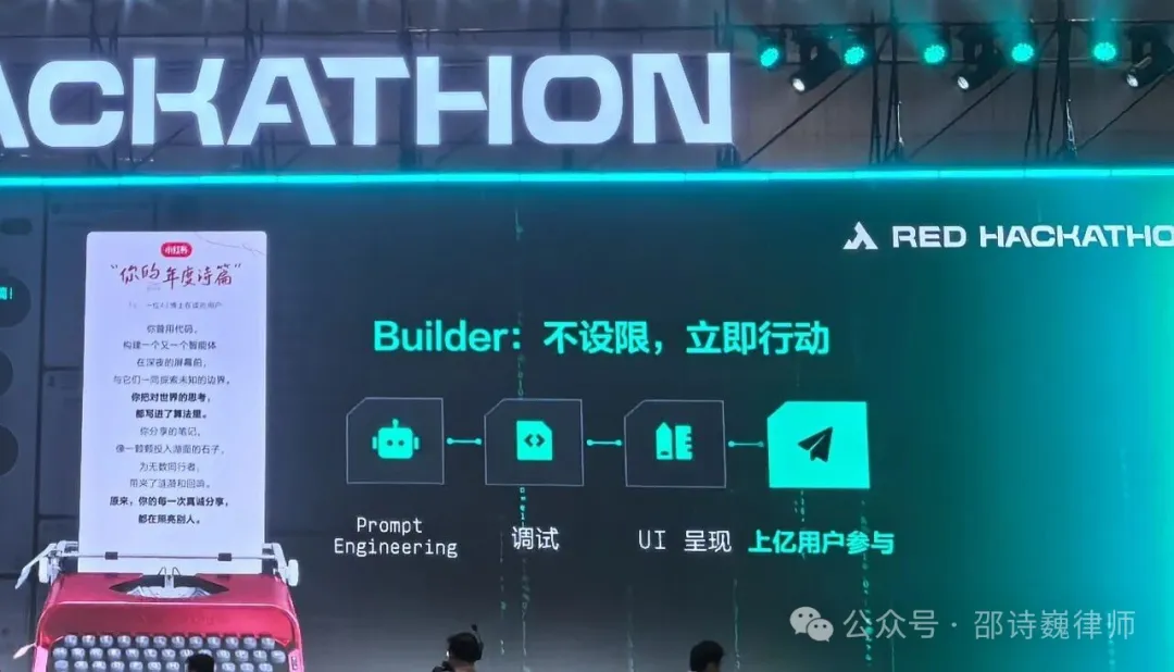 而这恰恰是跨界者的主场。在本次的小红书黑客松巅峰赛现场,我也看到了来到现场参赛的律师同行,这是让我感到意外和惊喜的。