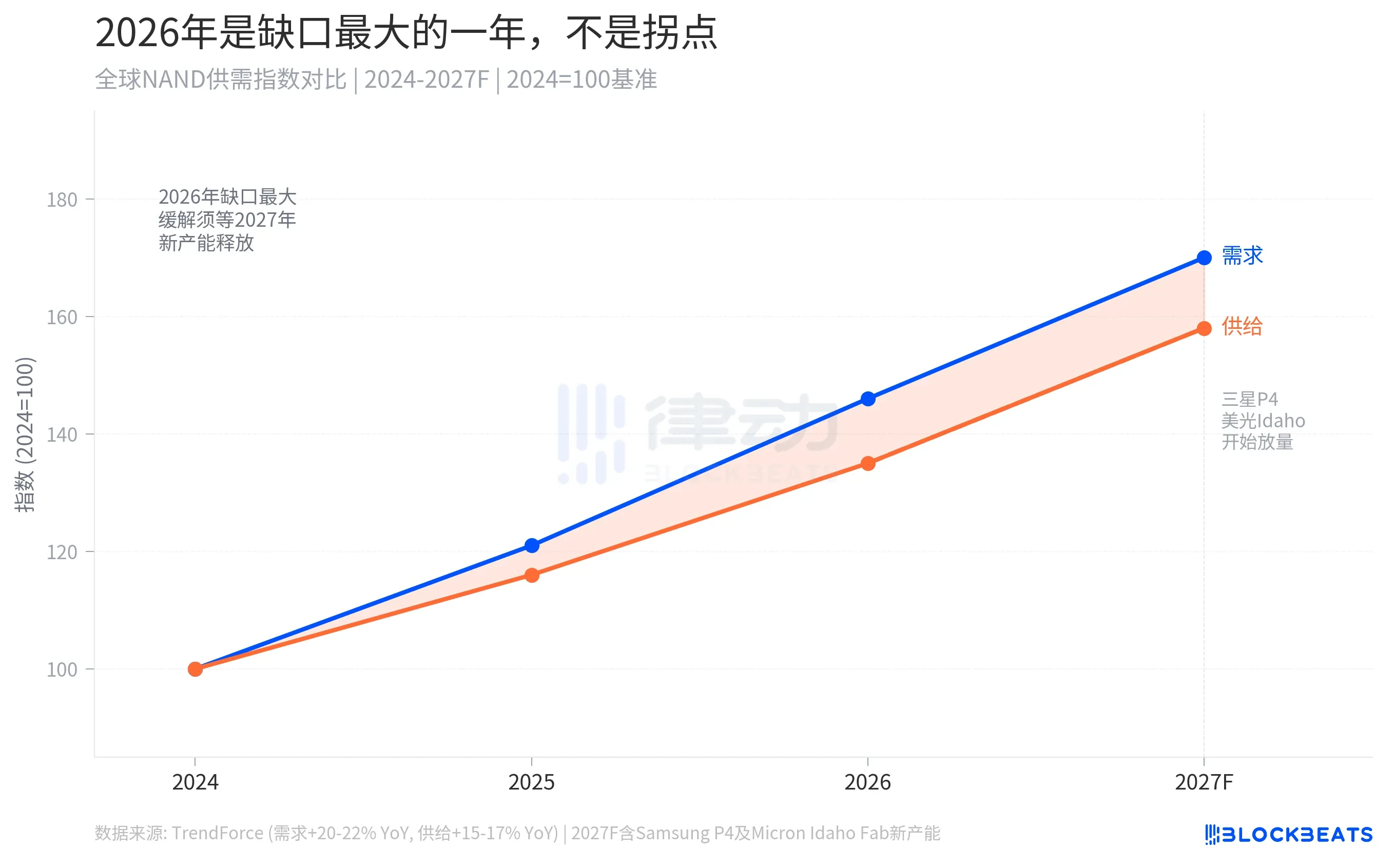 新增产能缓解供给紧张,要等到 2027 年底至 2028 年。三星京畿道平泽 P4 厂区的 NAND 产线、美光在美国爱达荷州的新晶圆厂、铠侠岩手工厂的扩产,都指向这个时间窗口。2026 年是供需缺口最大的一年,不是价格的拐点。