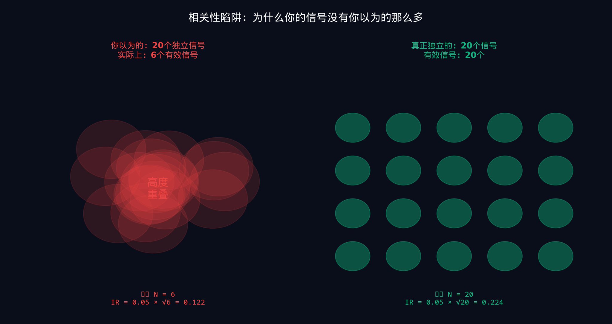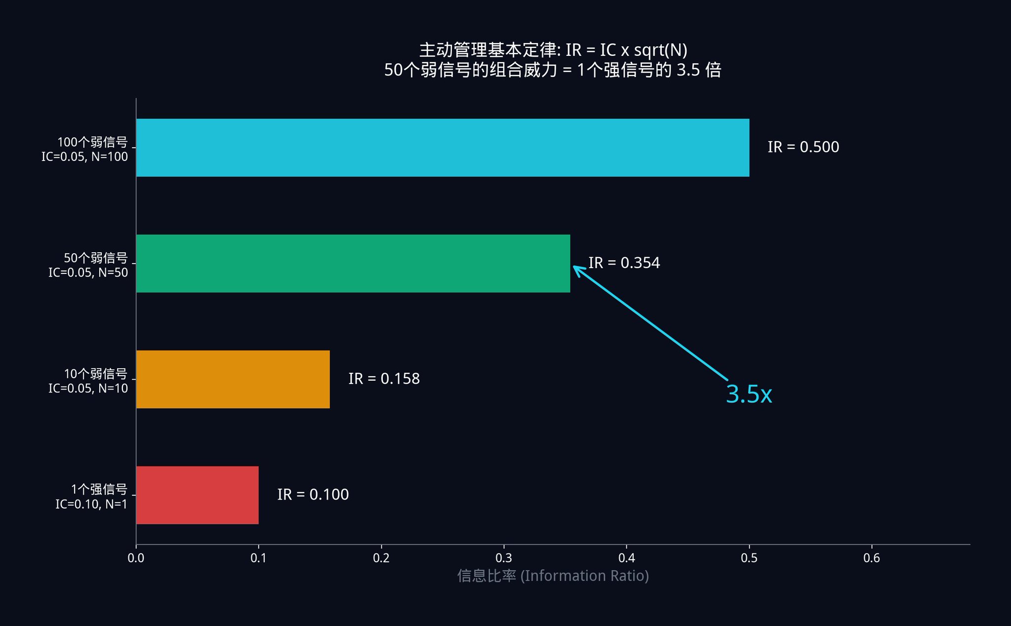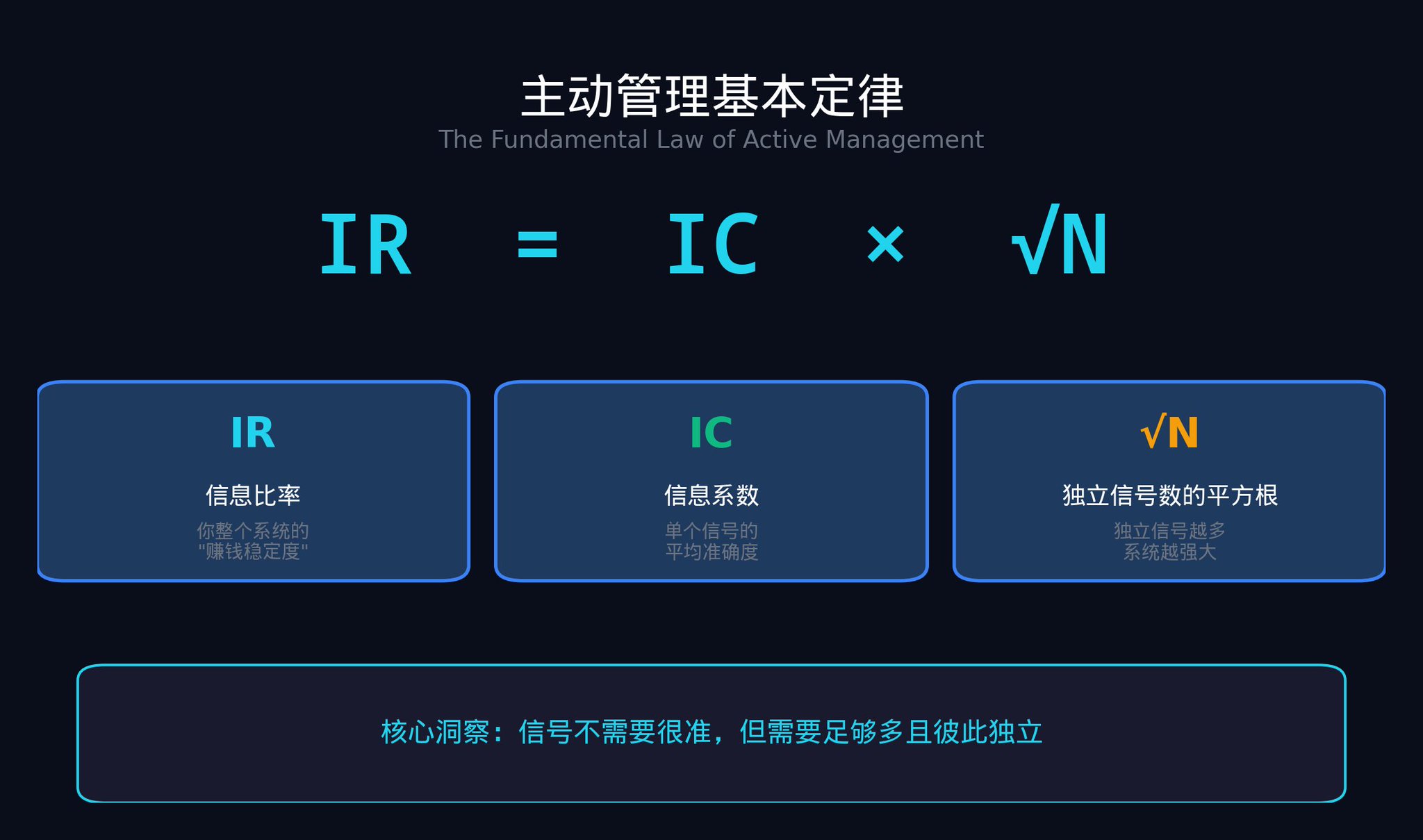 主动管理基本定律(IR = IC x √N)在数学上证明了:组合许多微弱的独立信号,胜过寻找一个强信号。你的信息比率随着你部署的真正独立信号数量的平方根而增长。