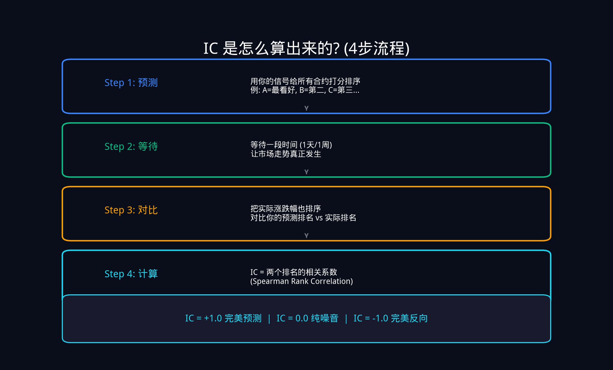 · 如果你预测排第 1 的合约,实际上也涨得最多;你预测排第 2 的,实际上也排第 2,那你的两列排名就高度一致,IC 就接近 +1.0。