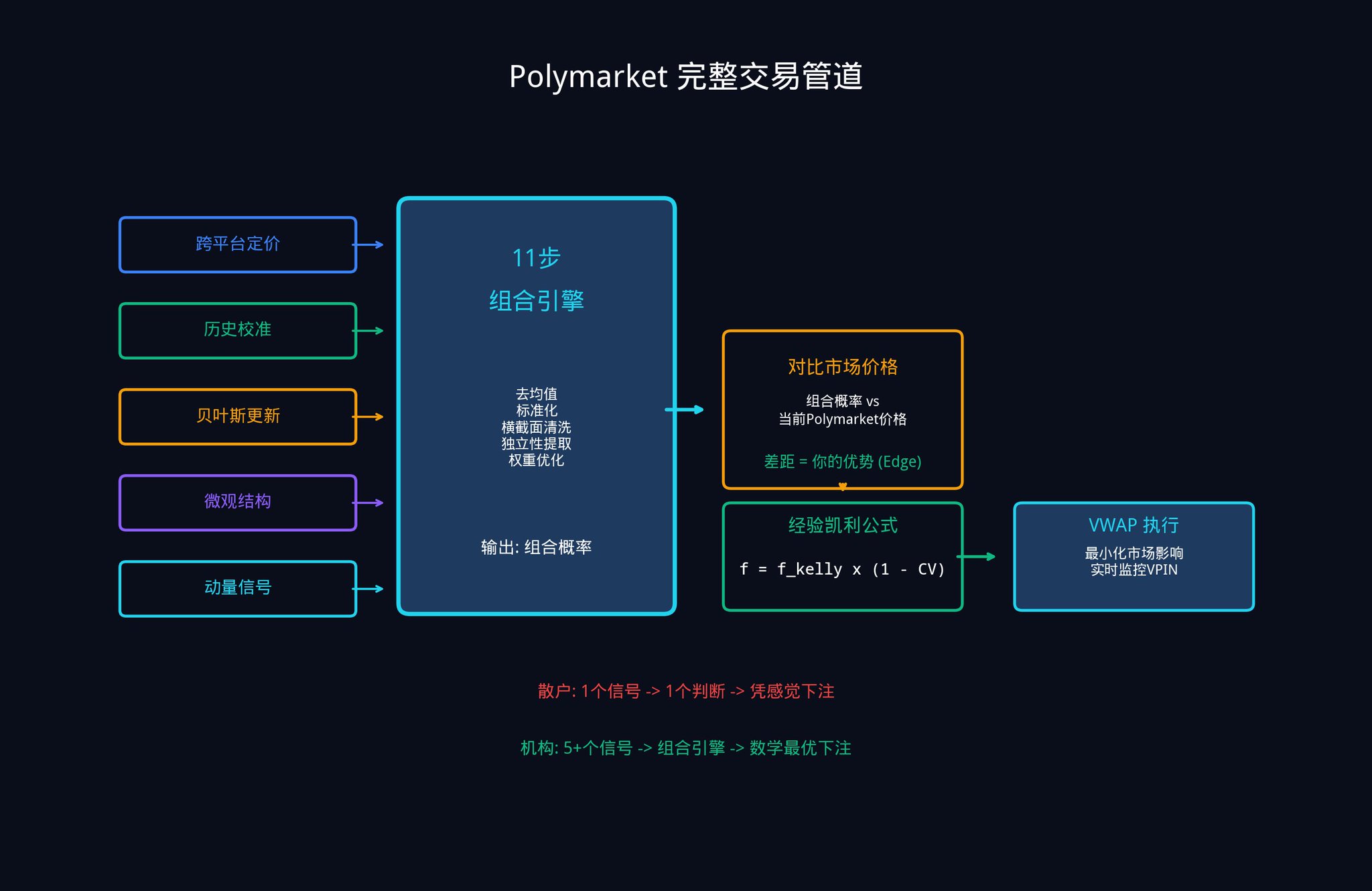 这个框架对于预测市场特别有价值,原因很简单:你的绝大多数竞争对手,都在用单一模型、单一数据源、单一概率估计来交易。而你现在已经知道了如何把多个弱信号组合成一个强信号。这就是你的结构性优势。