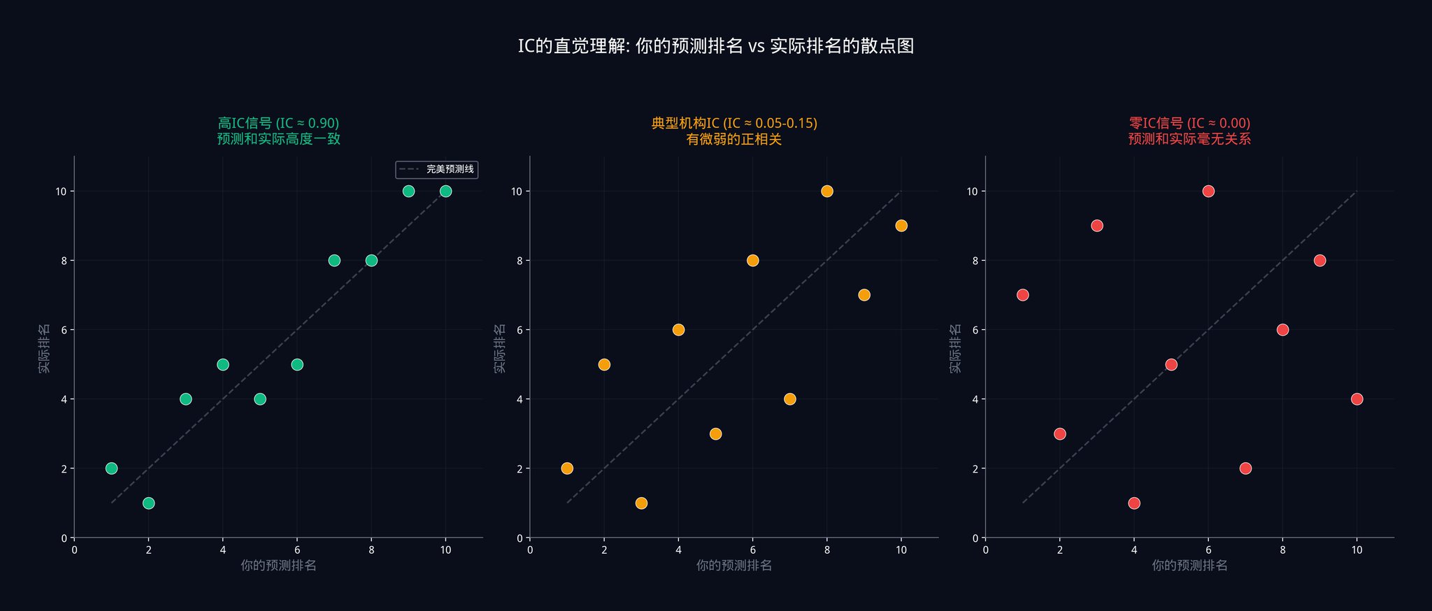 上面这张图展示了三种不同 IC 水平下,预测排名和实际排名之间的关系。