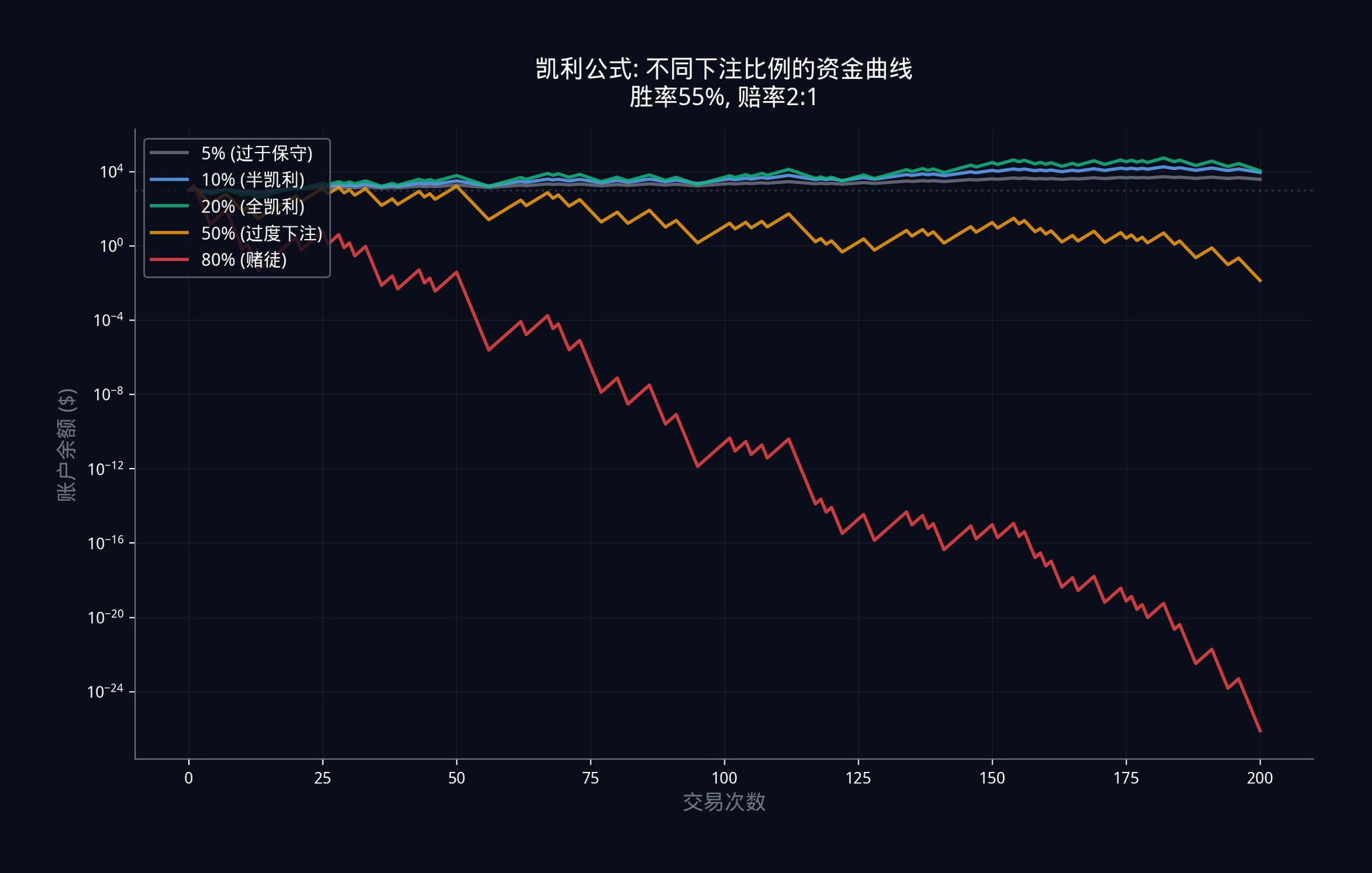 在实际操作中,很多机构甚至只下「半凯利」(Half-Kelly),也就是再除以 2,变成大约 12%。 因为长期来看,少赚一点远比爆仓好得多。