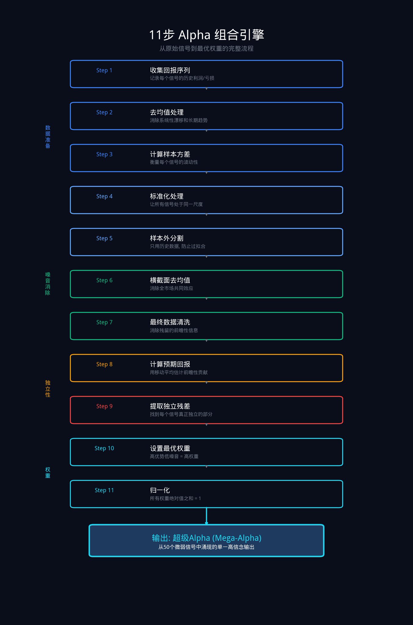11 步 Alpha 组合引擎为你提供了计算最优权重的精确方法。这些权重反映了每个信号的独立贡献,惩罚了噪音,消除了信号之间的共享方差。